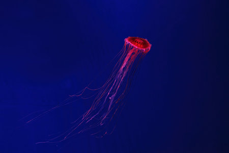 Fluorescent jellyfish swimming underwater aquarium pool with red neon light. The Japanese sea nettle chrysaora pacifica in blue water, ocean. Theriology, biodiversity, undersea life, aquatic organism