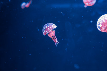 A vibrant spotted jellyfish drifts gracefully in the deep blue sea, its bioluminescent glow illuminating the dark water. The jellyfish has a translucent bell with red spots.