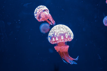 Two fluorescent jellyfish swimming underwater aquarium pool with red neon light. The Japanese sea nettle chrysaora pacifica in blue water, ocean. Theriology, biodiversity, undersea life, aquatic organism