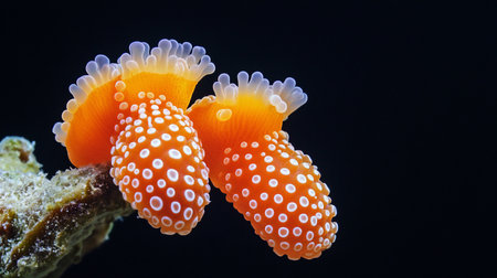 Pair of vivid orange nudibranchs, bodies covered in prominent white polka dots, displaying delicate translucent frilly gills.