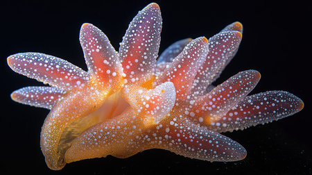 A detailed view of a sea star, showcasing its numerous arms, textured surface, and delicate white spots against a dark background, highlighting its unique marine beauty.