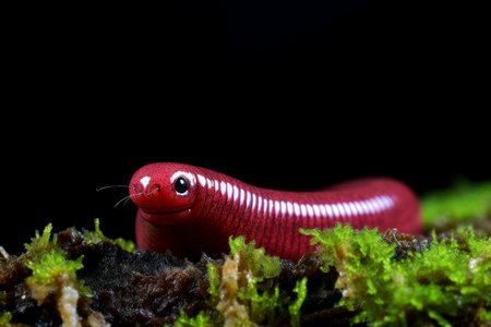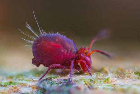 Detailed shot of a red velvet mite in a dewy forest environment