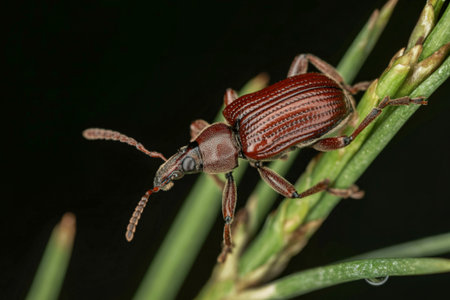 A macro photograph showcases a red chestnut weevil perched on a slender green plant stem against a stark black background. The insect's intricate details are clearly visible.