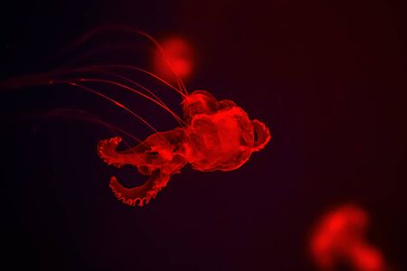 Selective focus of jellyfishes in red neon light on black background