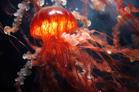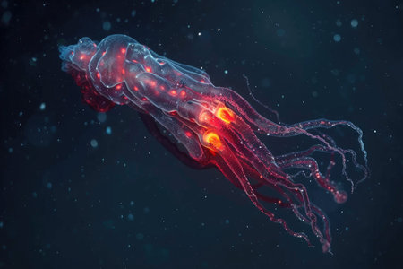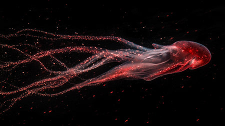 3d illustration of jellyfish floating in water with red glowing particles
