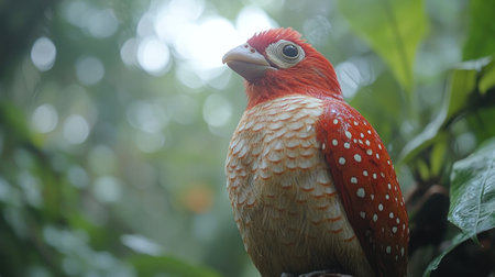 Brightly colored bird resting on a branch in a vibrant rainforest full of foliage.