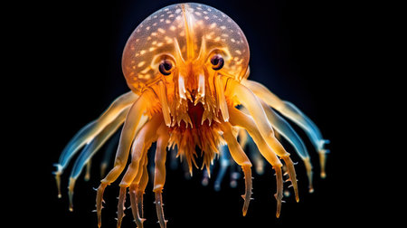 A close-up, brightly colored jellyfish with glowing tentacles and distinct orange spots, showcasing intricate textures and bioluminescence.