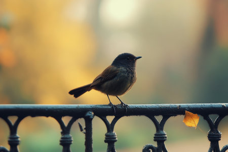 A small bird perches on a wrought iron fence while vibrant flowers bloom nearby. The soft golden light of sunset creates a tranquil atmosphere in the garden.