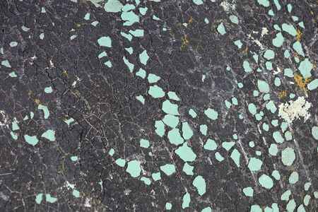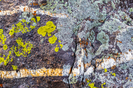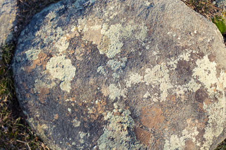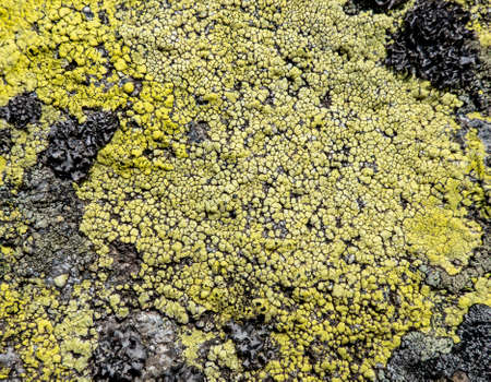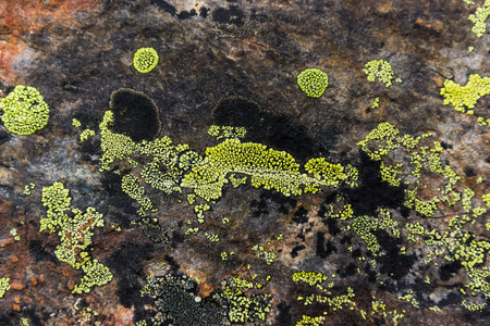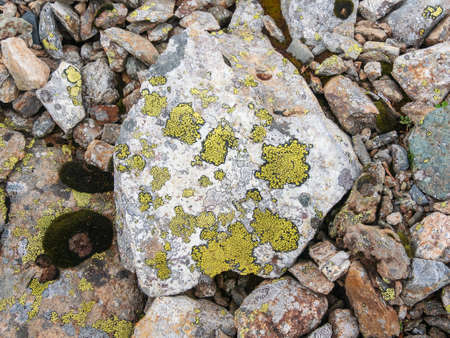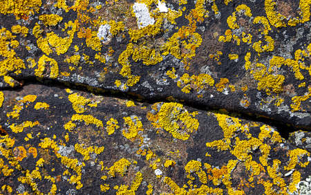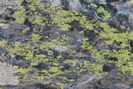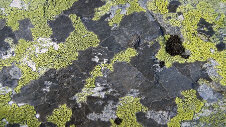 Natural background texture. Surface rock (stone) covered with yellow, blue, black gray spots of lichen and moss.