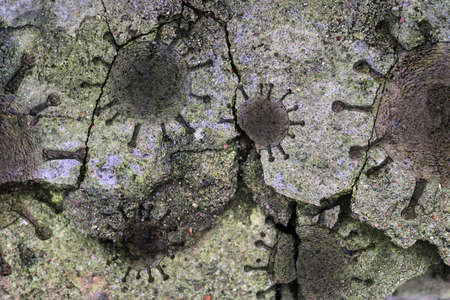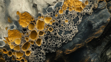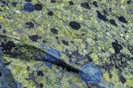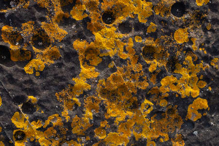 Background of random organic pattern of bright coloured lichen on a rock with circular indentations