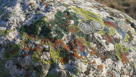 Close-up view of colorful lichen growing on weathered wood, showing the intricate patterns and textures of this symbiotic organism in a natural setting