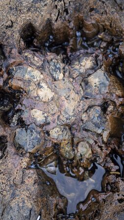 Fossilized sea animal on coast of Indian Ocean, Bali, Indonesia. Structure of sea coral fossil of yellow black color. Water in small recesses of coral. Sun's rays are reflected from the water surface.