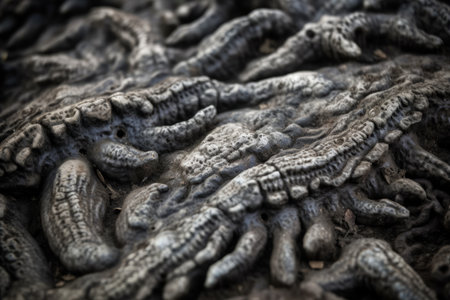 Plant roots growing through soil. Intricate network of roots in rich, dark soil surrounded by organic debris and small stones