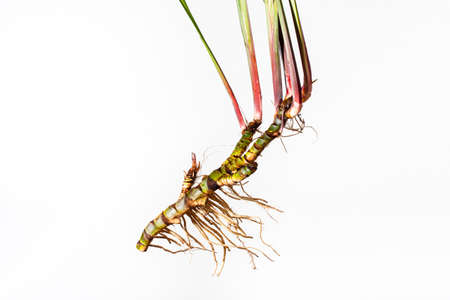 Fresh Acorus calamus roots, also known as sweet flag, isolated on light background. Calamus root is used in shampoo, hair conditioner, body lotions, bathing soaps, toothpaste and other personal care products. Beauty and medicine.
