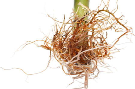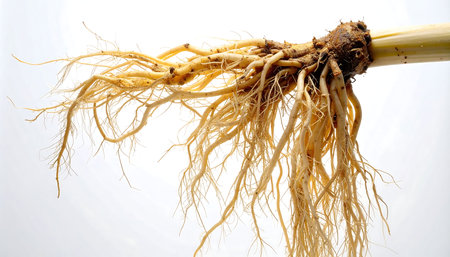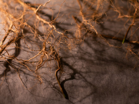 A detailed view of a plants root system with tiny roots branching out in all directions