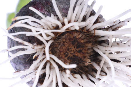 Cactus disease dry root rot caused by fungi, half cut fungi infected Gymnocalycium cactus isolated on white background showing serious damge at skin and root