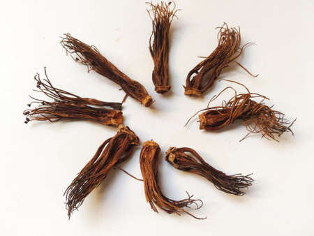 Dried herbal plant root on baking paper. Herbal medicine concept.