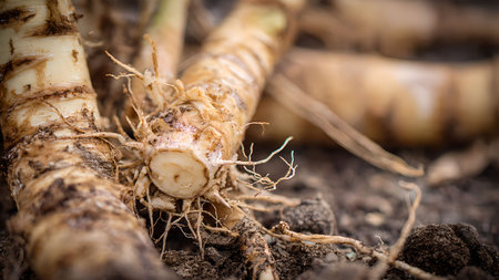 Fresh ginger roots grown in soil. Roots of ginger ready to be harvested from ground and used in food and in medicines