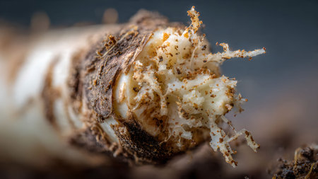 Fresh brown root vegetable with fibrous texture and exposed white flesh on a grey background