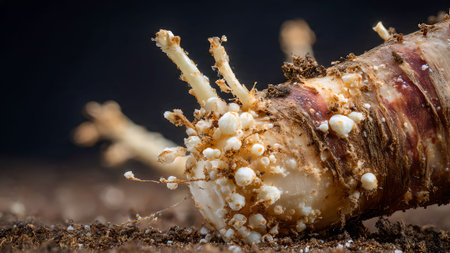 A detailed macro shot showcases the intricate network of white plant roots emerging from dark, textured soil, with tiny particles suspended in the air.