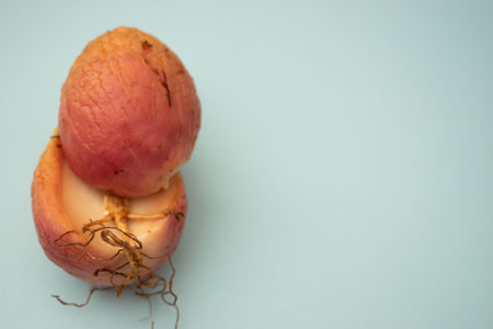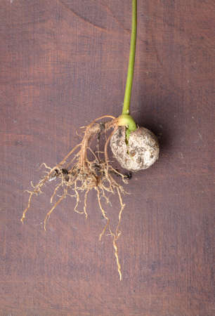Rambutan seed sprout, plant growing process, fresh roots on a wooden table.