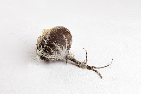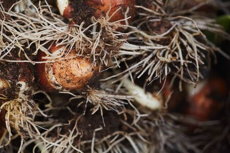 Background image of tullip bulbs and roots ready to plant in flower garden, copy space
