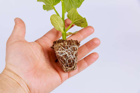 A farmer holds a cucumber seedling in his hand and shows a healthy root on a white background.