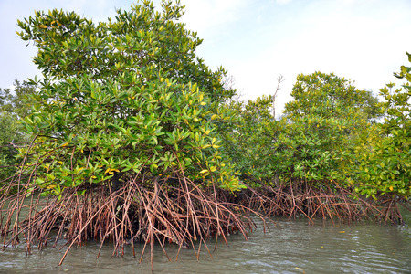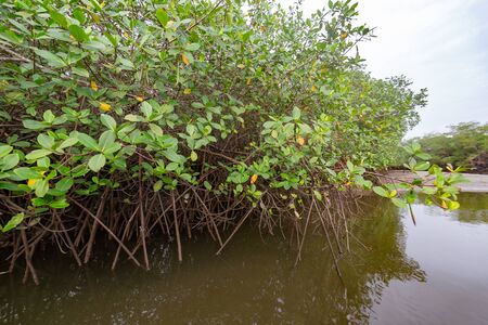 Mangrove trees in mangrove forests with twig roots grow in water during low tide