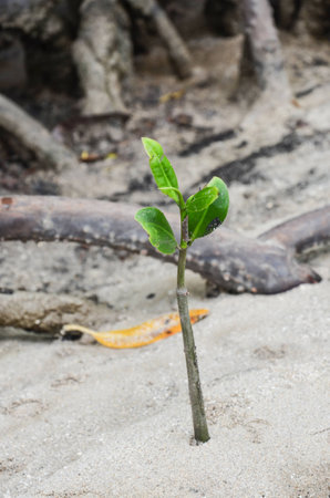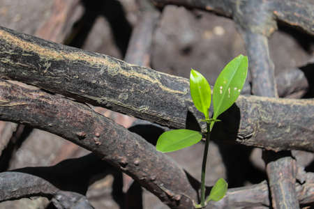 Young mangrove. A young sprout of mangroves in the safety of the roots of other mangrove shrubs. Close up of a small Red Rhizophora plant among tangle of roots. Beginning life of a new plant.