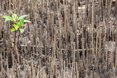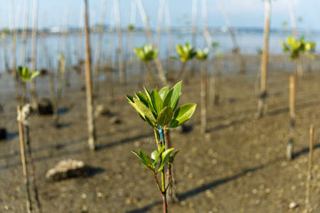 Mangrove seedlings growing in coastal wetlands nature conservation plant life bright daylight low-angle view for environmental awareness