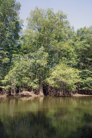 Tropical mangrove forest island river sea against blue sky environmental conserve