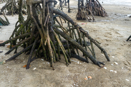 Close up mangrove tree roots system during low tide, Surin island national park, Thailand