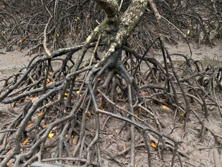 Intertwined mangrove roots adapted to saline, waterlogged conditions in tidal zone.