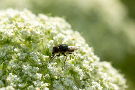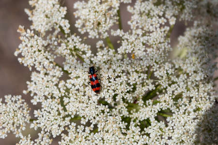 On a flowering medicinal plant carrot sits a bright beetle with red stripes common bee beetle] (lat. Trichodes apiarius).