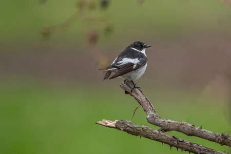 Close-up portrait of a male Semi-collared Flycatcher, Ficedula semitorquata sitting on a branch against a blurred background