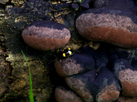 Brown color mushrooms or conks on a decaying tree, parasitic organism, selective focus