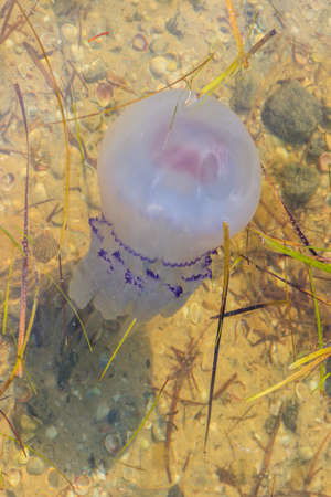 Rhizostoma pulmo, commonly known as barrel jellyfish, dustbin-lid jellyfish or frilly-mouthed jellyfish floating in a sea