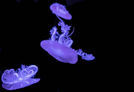 Background of beautiful blue neon jellyfish. Aquarium.