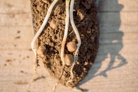 The Jerusalem artichoke harvest. Autumn organic vegetable garden.