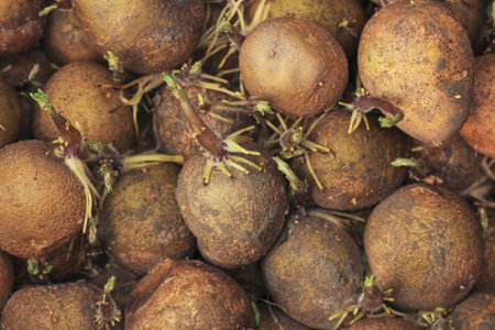 Close-up of sprouted potatoes. Potato tuber ready for planting in the ground. On yellow background. Copy space