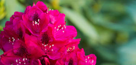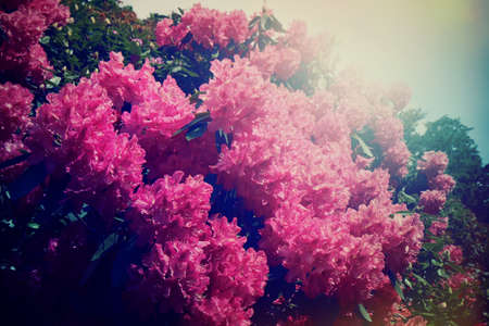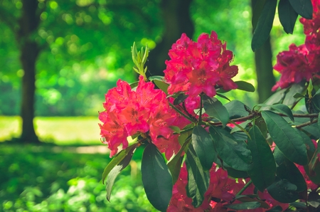 rhododendron bushes with vibrant fuchsia color flowers on a bokeh effect background.