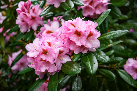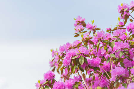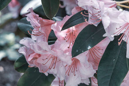 Flowering of fresh tender Rhododendron maximum pink flowers with green leaves at spring time. Natural floral seasonal holiday background with copy space.