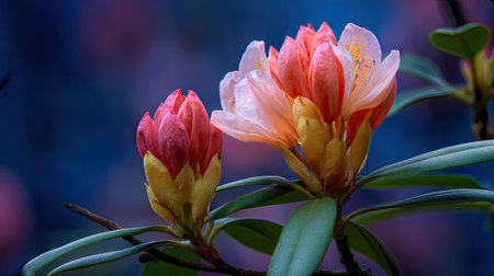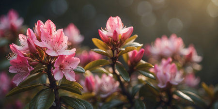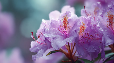 Vibrant rhododendron blossom with water droplets in artistic soft lighting