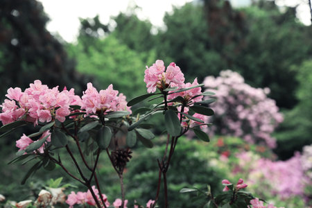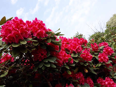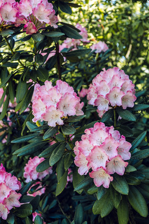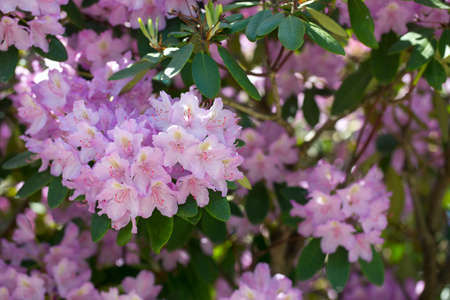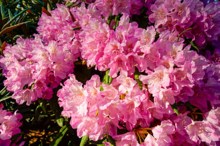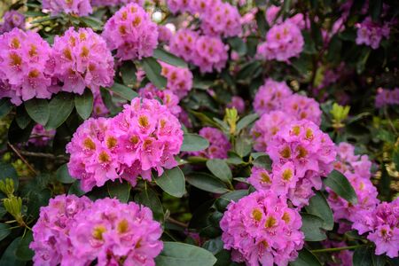 Bush of the Rhododendron in the botanical garden. Beautiful floral background. Decorative summer plants.
