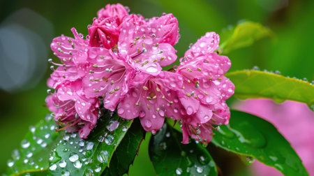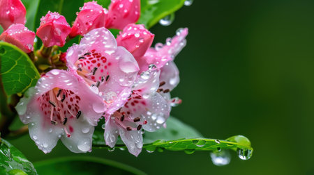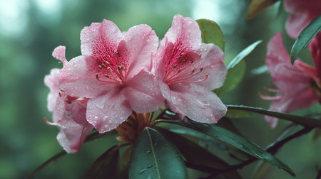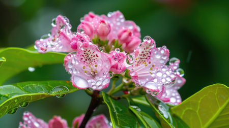 Delicate Pink Rhododendron Blossoms Adorned with Raindrops Glisten in the Sunlight