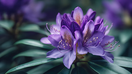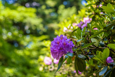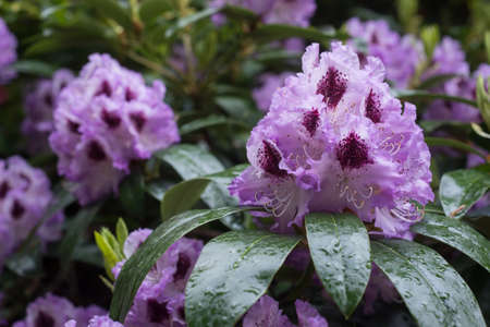 Closeup of beautiful purple rhododendron flowers bloom bush. Summer floral foliage composition