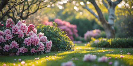 Delicate pink azaleas bloom vibrantly in a lush garden setting under warm spring light showcasing their stunning petals and colors.
