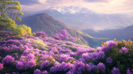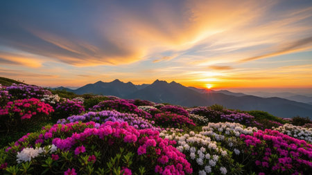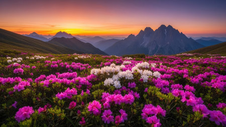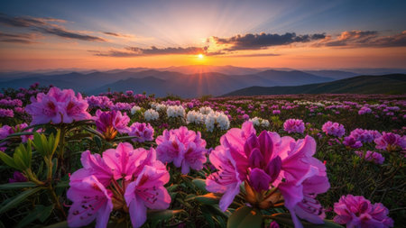 The sun rises, casting a warm glow over a mountain range with vibrant pink rhododendron flowers in full bloom.