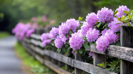 Purple rhododendron flowers growing along a wooden fence in springtime