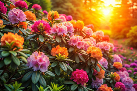 Vibrant Rhododendron Blooms in Golden Sunlight - Low Light Photography Stock Photo